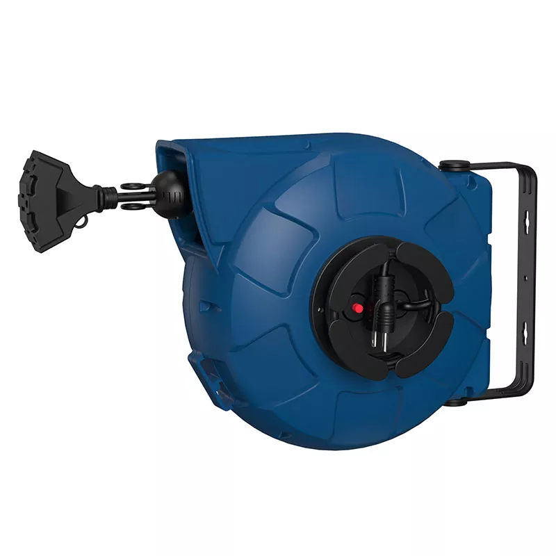 Suporte de aço para montagem de parede, alojamento de plástico resistente e alça de transporte prático: o carretel de cabo elétrico é a extensão ideal do cabo.
